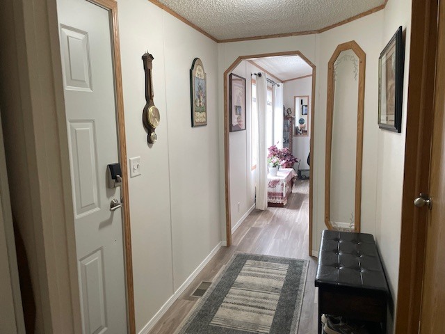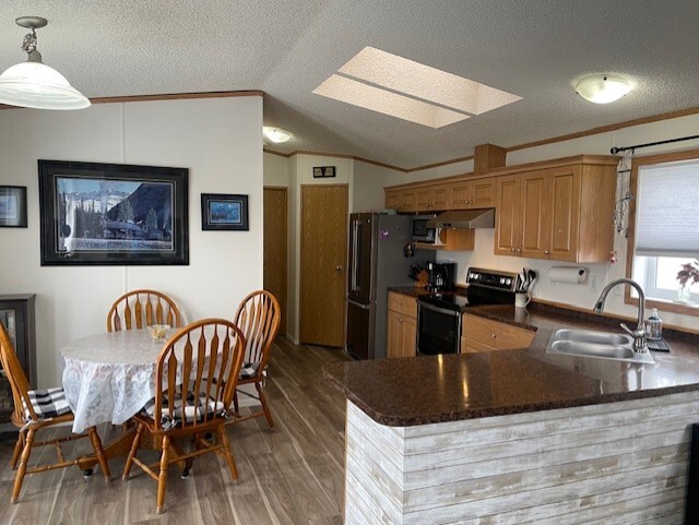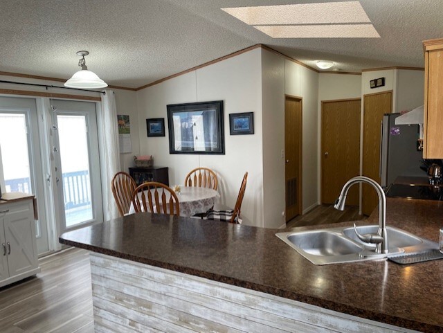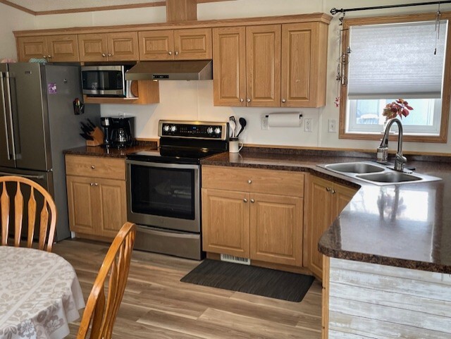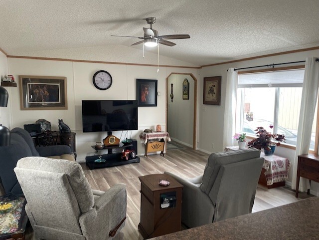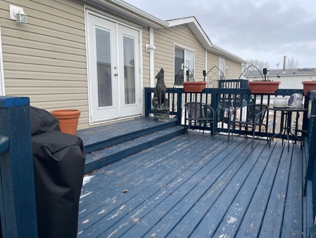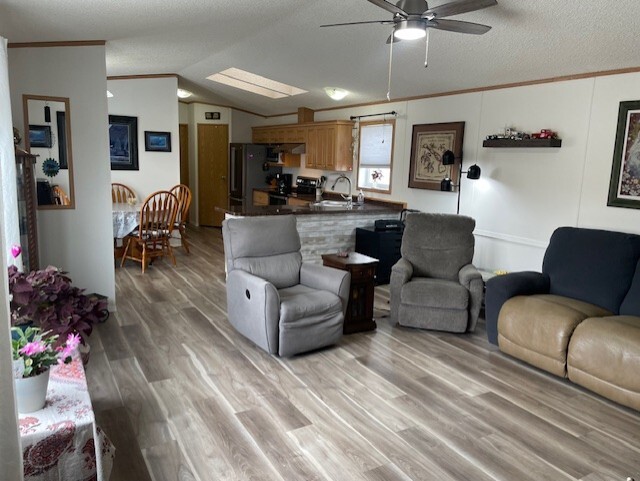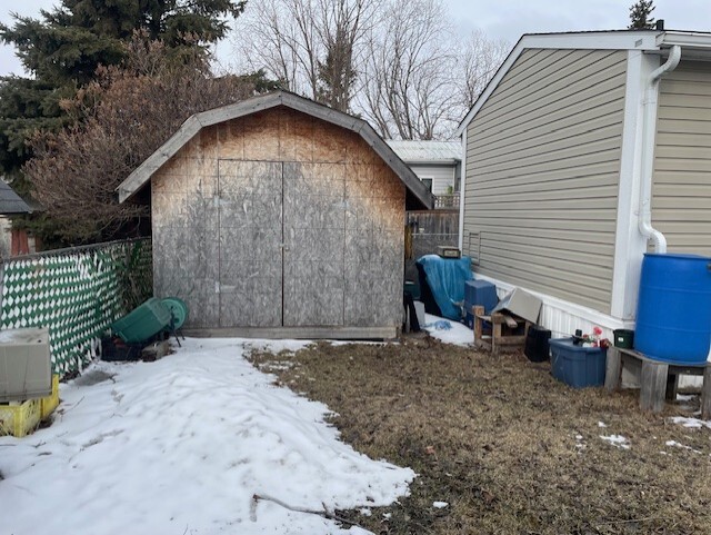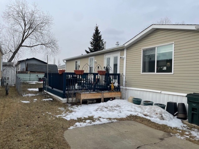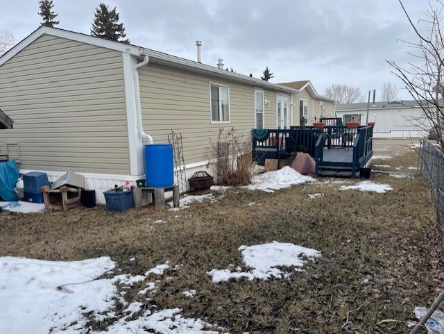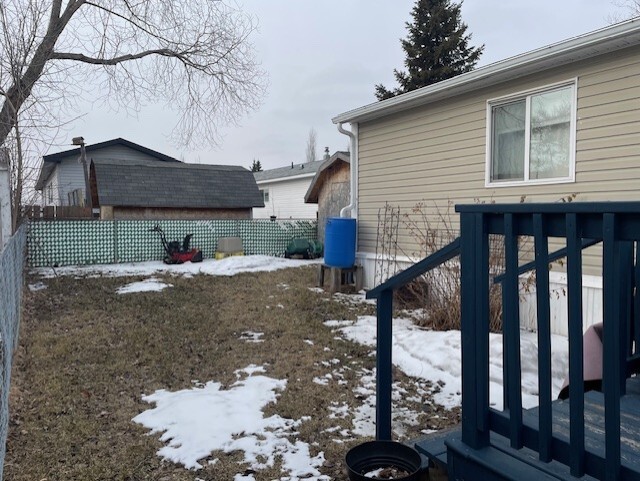 This bright open plan mobile home has been painted, has cathedral ceilings and newer flooring throughout. The main living areas have new vinyl plank flooring and there is newer carpeting in the 3 bedrooms. The SS kitchen appliances are newer (2024) and include a built-in dishwasher. The living room is spacious has a ceiling fan and large window. The kitchen has a skylight that is fitted with a screen (lets in the light while reducing heat), peninsula countertop, corner pantry and garden doors that lead to a large deck. The primary bedroom also has cathedral ceilings and is a great size that could easily accommodate a king size bedroom suite, has a ceiling fan and a walk-in closet. The ensuite has an oval jacuzzi tub and a newer dual flush toilet. The main 4 pc bath is conveniently located on the opposite end of the home near the 2nd and 3rd bedrooms. Window coverings and a newer washer and dryer (2024) are included. The furnace was replaced in 2025 and the heat tape was replaced in 2023. The yard is fully fenced with chain-link, located in a quiet area near the park and there is a 10x12 storage shed. The lot fee is $715/month and property taxes are approx. $844.66/2025. Don't wait to view this lovely home!